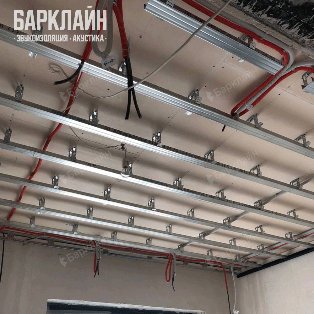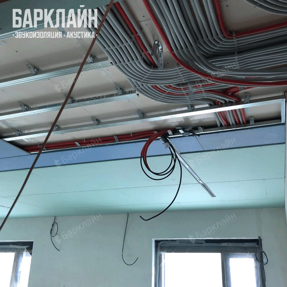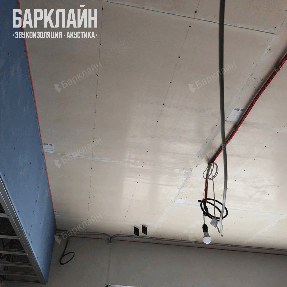 Потолок: Смонтирована Каркасная система звукоизоляции потолка «Барклайн Базовая Плюс». Эта система обеспечивает виброразвязку с перекрытием через виброподвесы «ВиброСорб Мастер» и заполнение каркаса плитами «БасАкустик ПРО 50». Поверх системы была аккуратно проложена вся инженерная проводка (электрика, вентиляция), а затем смонтирован подвесной потолок из двух слоев гипсокартона – акустического и обычного.