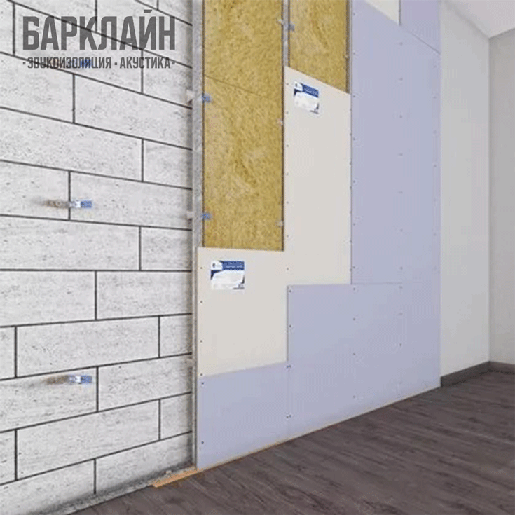 Монтаж каркасной системы «Барклайн Базовая» на стены, (толщина 80 мм, ΔRw – 18 дБ, Rw - 72 дБ)