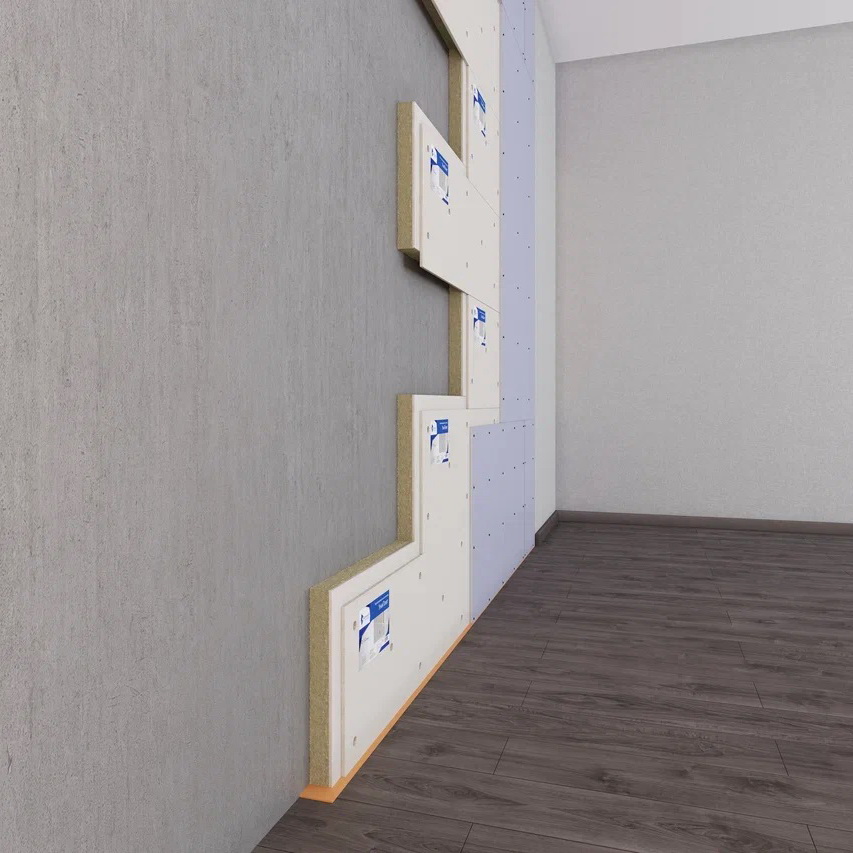 Для УниПлит от 100мм используйте ВиброСорб 100мм монтируйте с отступом от основания, таким образом чтобы гипсовая часть панели и последующая облицовка из ГКЛ опирались/примыкали на/к ВиброСорб. Оклейте периметр примыкающих к подлежащей облицовке стены поверхностей(стены, потолок, пол) .