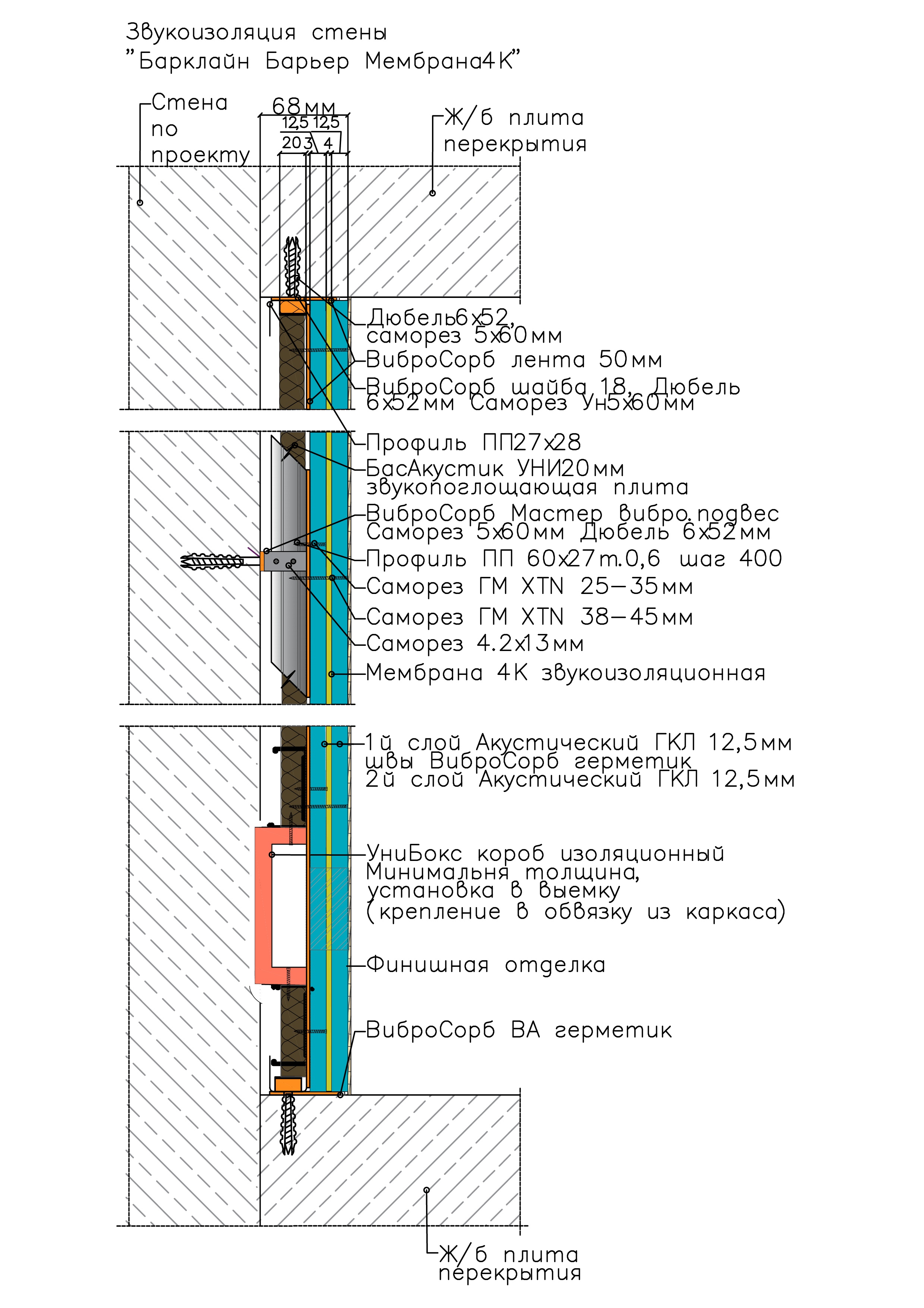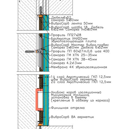 Система начинается с монтажа металлического каркаса (обычно из профилей ПП60*27 ПП 27*28), который крепится к стене с помощью виброизоляционных подвесов ВиброСорб. Это основа всей конструкции, обеспечивающая необходимую жесткость и стабильность.