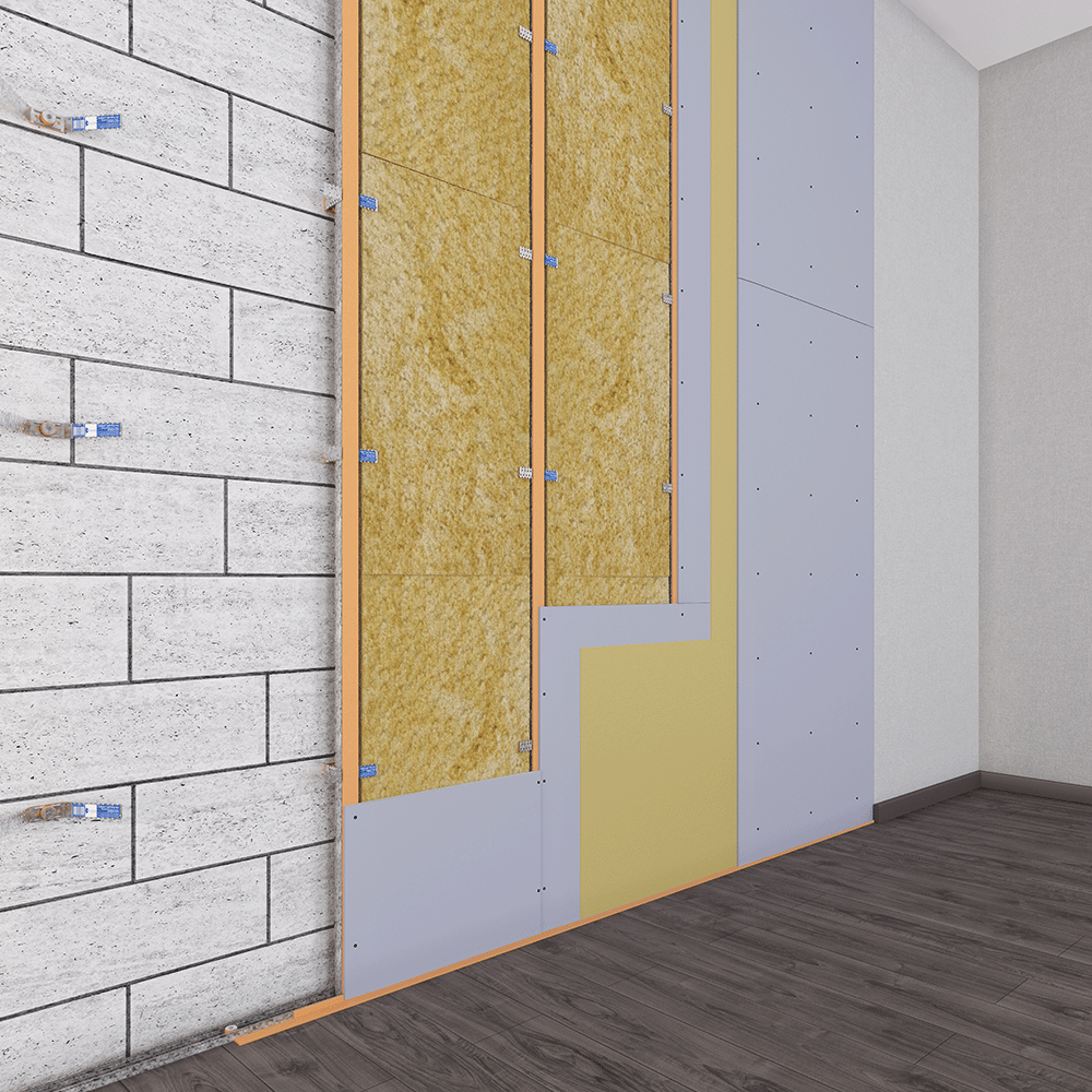 Система начинается с монтажа металлического каркаса (обычно из профилей CD и UD), который крепится к стене. Это основа всей конструкции, обеспечивающая необходимую жесткость и стабильность.