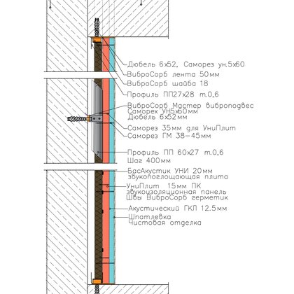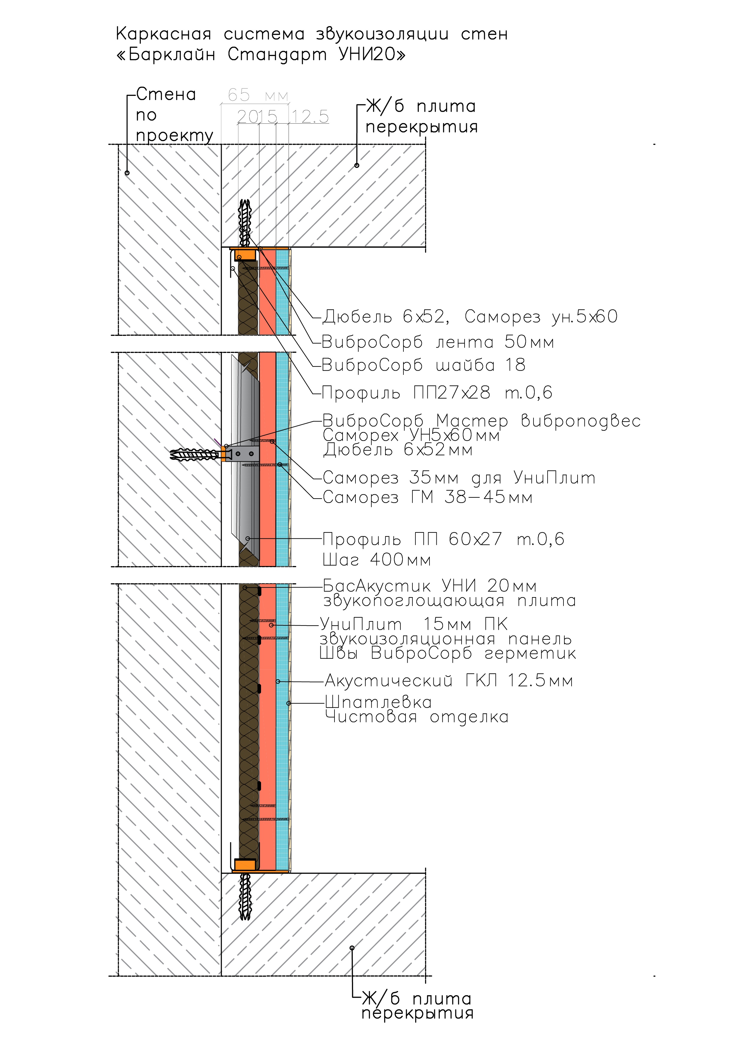 Тонкая каркасная Стандарт система повышенного уровня, 60мм толщиной эффективно уменьшит основной спектр воздушных и структурных шумов от соседей сбоку. Вибро-развязанный каркас за счет применения виброизоляционных подвесов ВиброСорб Мастер, заполненный шумопоглащающим материалом всего БасАкустик УНИ 20мм толщиной дает дополнительную защиту от низкочастотных звуков. Использование в системе звукоизоляционных панелей УниПлит 15ПК позволяет улучшить защиту стен от проникновения посторонних звуков. Финишный слой системы звукоизоляционный гипсокартон 12мм толщиной. Данная звукоизоляционная система идеально подходит как для монолитных стен, так и для перегородок из газобетонных блоков. Так же нет необходимости штробить стену под электрику, все провода прячутся в толще каркасной системы. Система подходит для любых помещений, в том числе с повышенной влажностью. Финишная отделка стен любая, от обоев до керамогранита.
