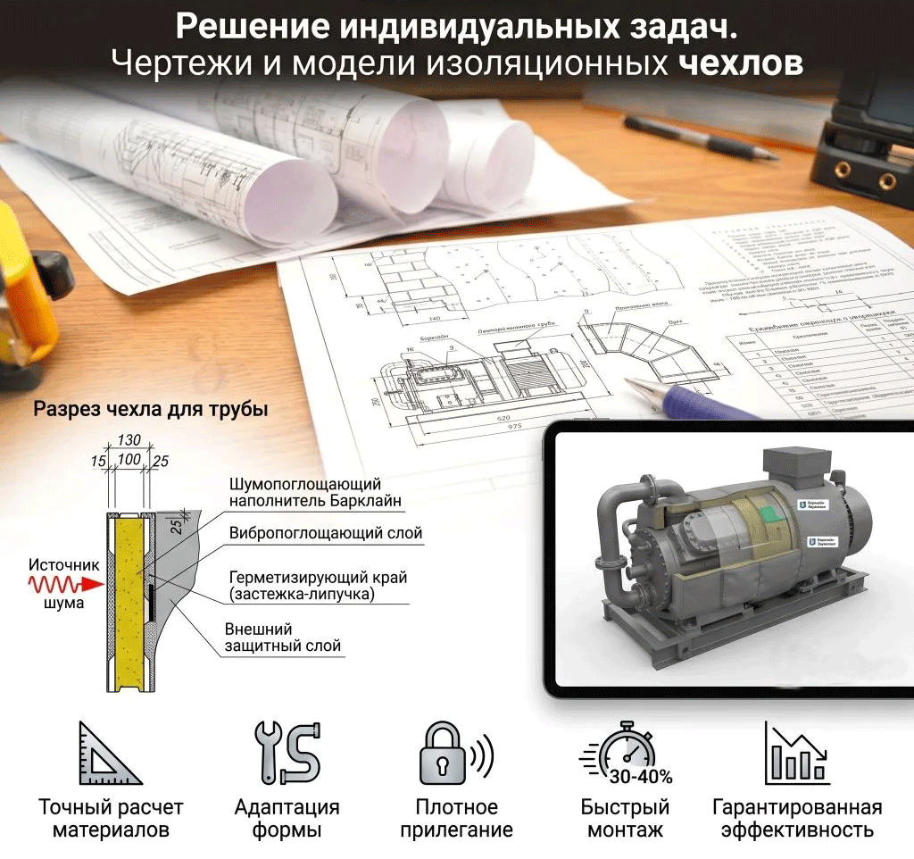 Компания «Барклайн» разрабатывает индивидуальные чертежи и 3D‑модели изоляционных чехлов — современное решение для снижения шума в жилых, коммерческих и промышленных объектах.
